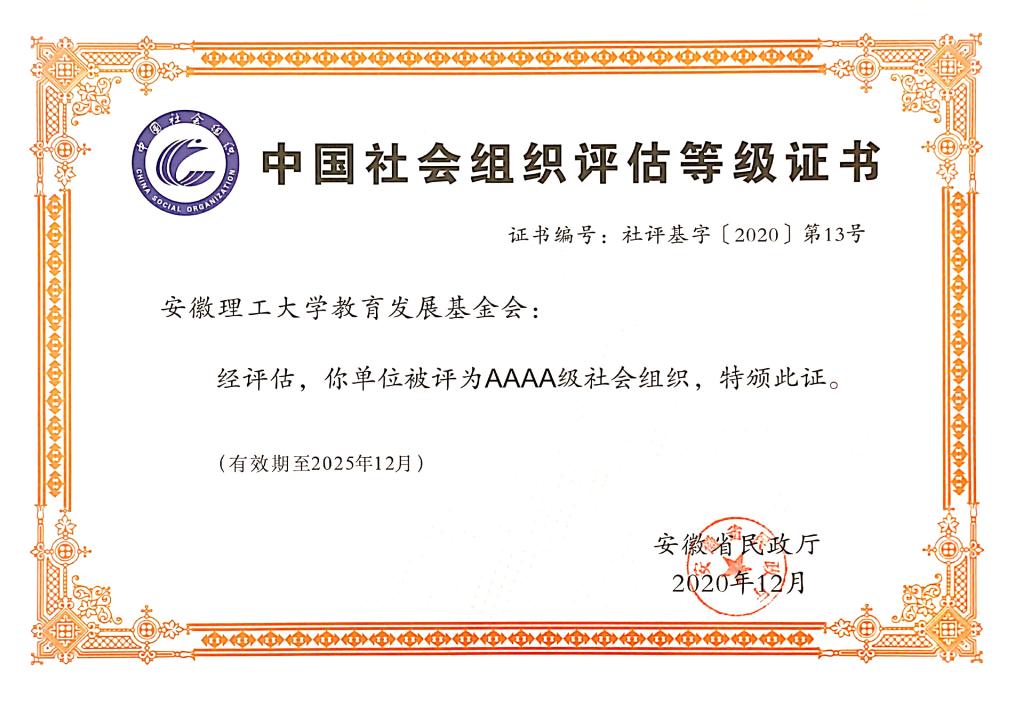 2020年12月10日,安徽省民政厅发布《2020年度省级社会组织评估等级结果公告》,我校教育发展基金会获评4A级社会组织。