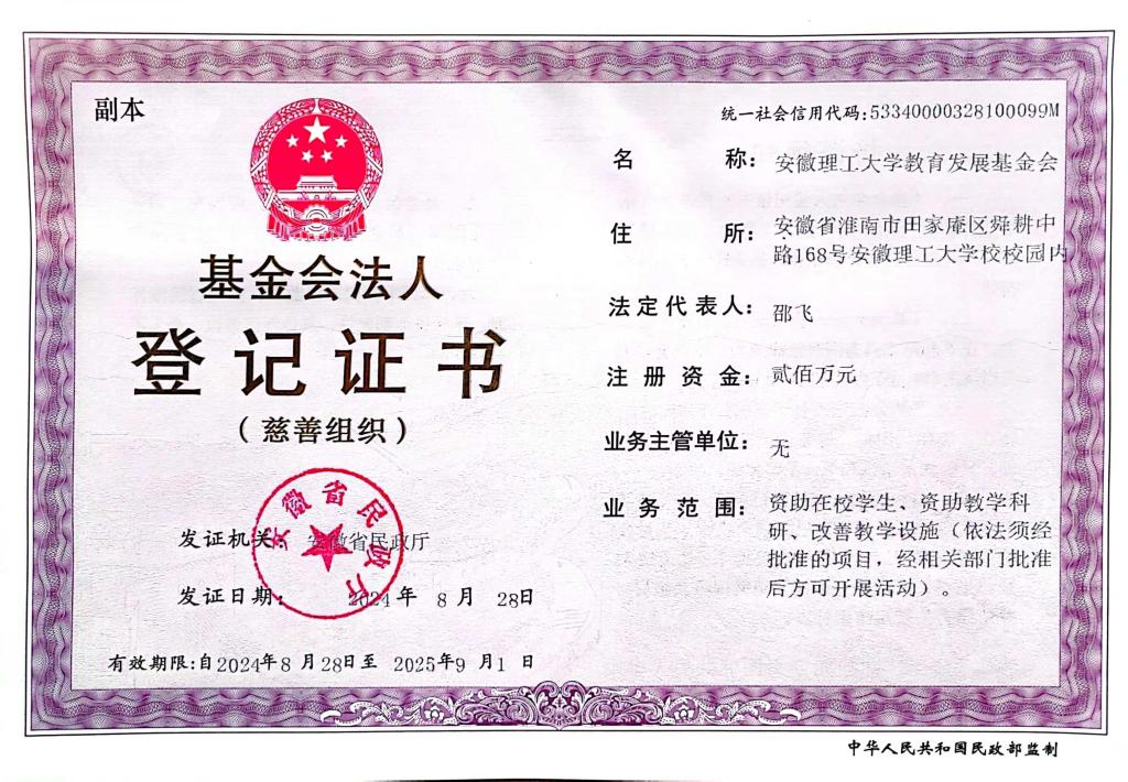 安徽理工大学教育发展基金会(以下简称“基金会”)成立于2015年2月,是经安徽省民政厅批准成立的非公募基金会。本基金会旨在致力于加强安徽理工大学与国内外各界的联系和合作,多渠道筹集办学资金,提高教育教学和人才培养质量,推动安徽理工大学教育事业的蓬勃发展。