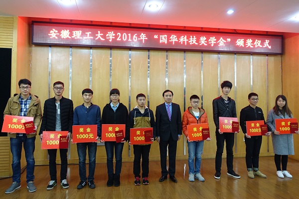 11月13日上午,2016年安徽理工大学 “国华科技奖学金”颁奖仪式在校本部新图书馆一楼北会议室隆重举行。我校杰出校友、北京国华科技集团有限公司董事长赵树彦一行应邀出席仪式并为获奖同学颁奖。校党委副书记王洪、校党委原书记张明旭出席颁奖仪式。