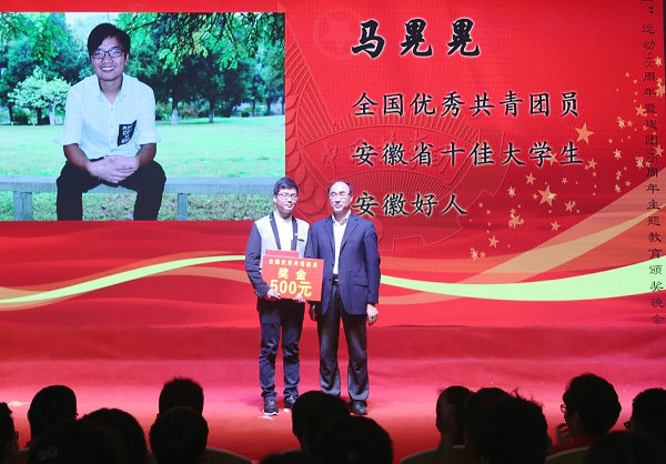 副校长郑明东为全国优秀共青团员、安徽好人、安徽省十佳大学生机械制造及其自动化2013-3马晃晃颁奖(摄影:王嫦欢)