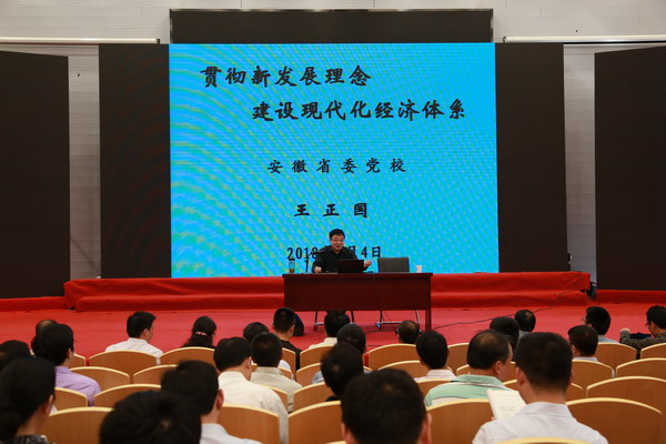 5月4日上午,安徽省委党校副校长王正国教授应邀来校,在舜耕会堂为全省高校第18期中层干部副职暨校基层党支部书记、科级干部学习贯彻党的十九大精神培训班全体学员,作党的十九大精神解读辅导报告。校党委常委、纪委书记周峰主持会议。